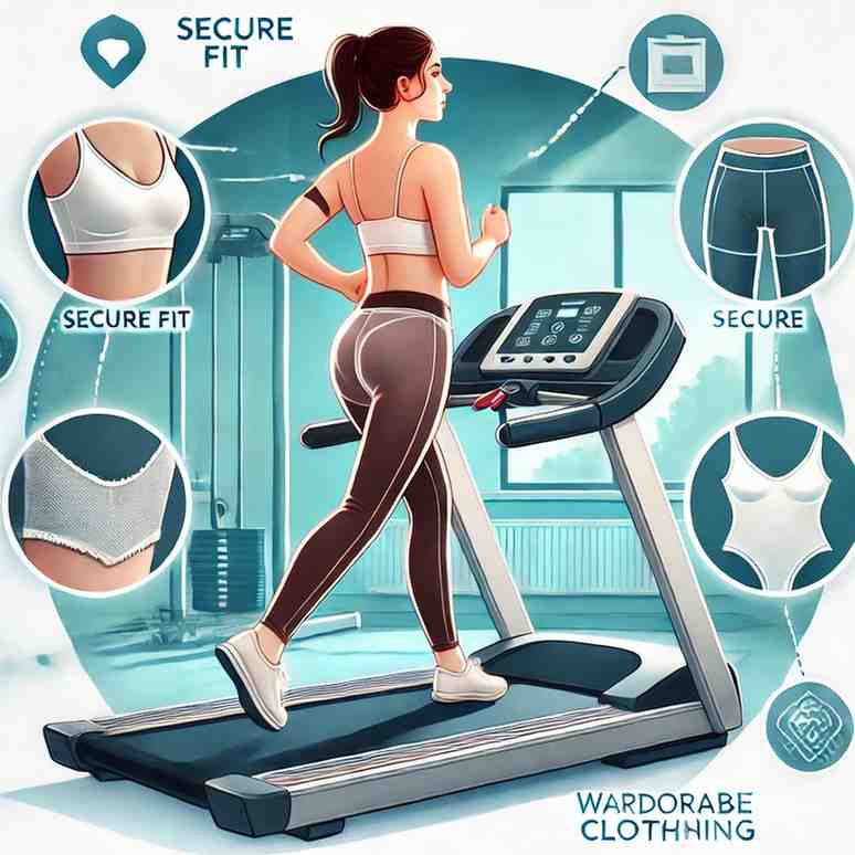 Here’s the image illustrating the importance of choosing the right workout attire to prevent treadmill mishaps, focusing on secure and comfortable clothing. The setting is a bright, organized gym with clear tips to ensure a safe and uninterrupted exercise session.